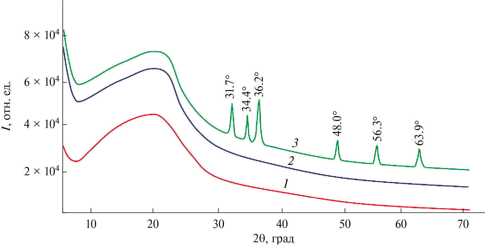 Рис. 3. Результаты рентгеноструктурного анализа пленок Nа-КМЦ (1), а также Zn2+КМЦ– (2) и ZnО-КМЦ (3) с мольным соотношением Na-KMЦ : Zn(NO3)2 = 100 : 6.