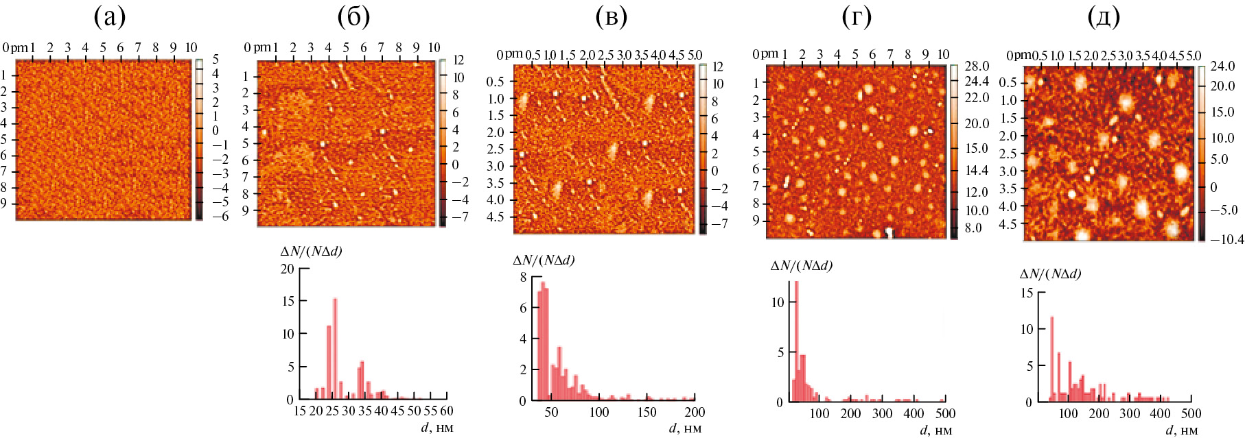 Рис. 4. АСМ-снимки исходной пленки Na-KMЦ (а), а также пленок Na-KMЦ с содержанием Zn(NO3)2 = = 0.00162 (б), 0.00324 (в), 0.00648 (г), 0.0081% (д) и их гистограммы распределения наночастиц ZnO по размерам на пленках.
