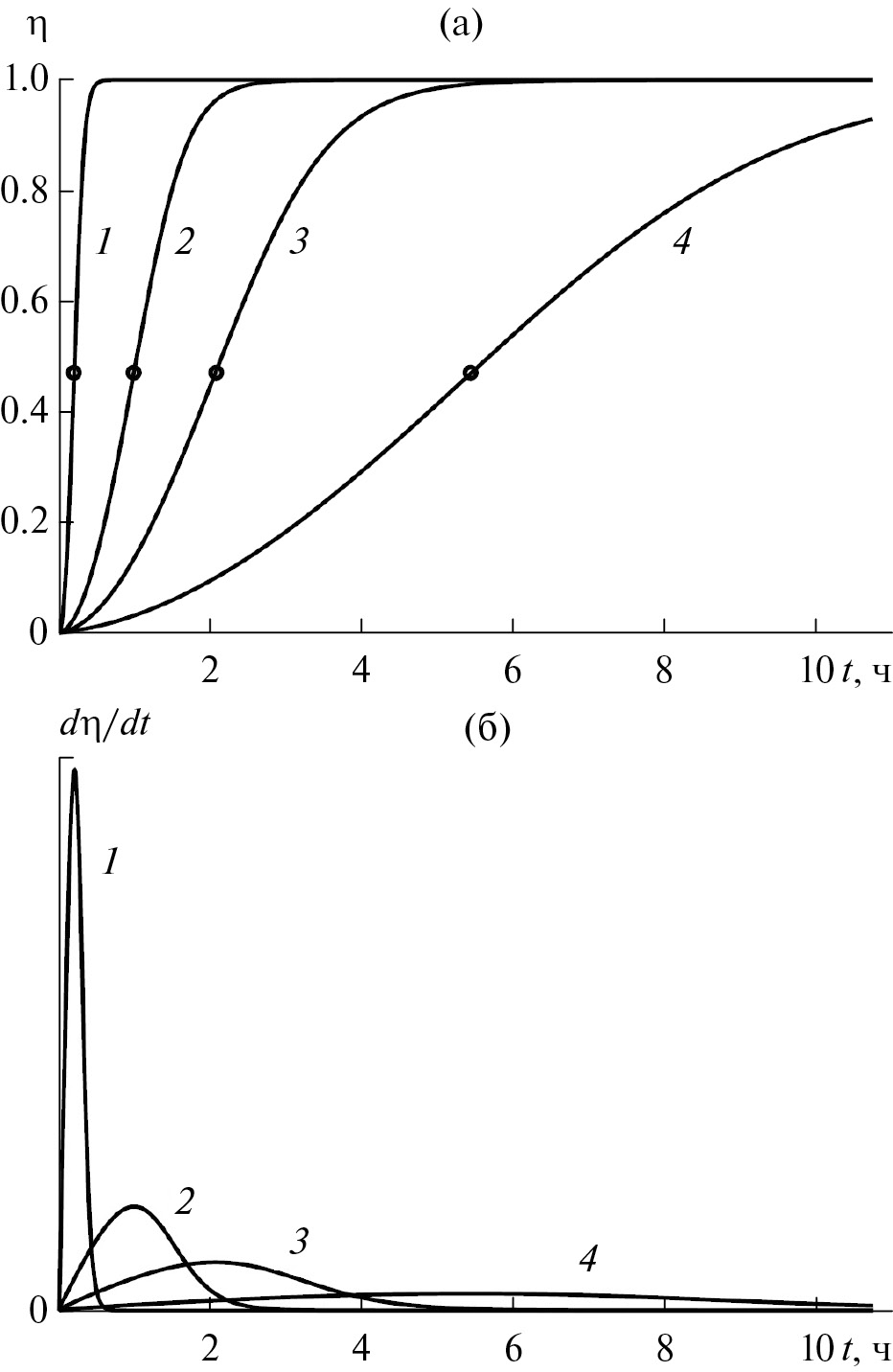 Рис. 1. Кинетические кривые, смоделированные для капель водного раствора молочной кислоты с исходным радиусом 10 (1), 30 (2), 50 (3) и 100 мкм (4), при условиях, соответствующих экспериментам [13]: а – конверсия мономера η, б – скорость поликонденсации dη/dt. На рис. 1а точками указано положение максимума скорости.