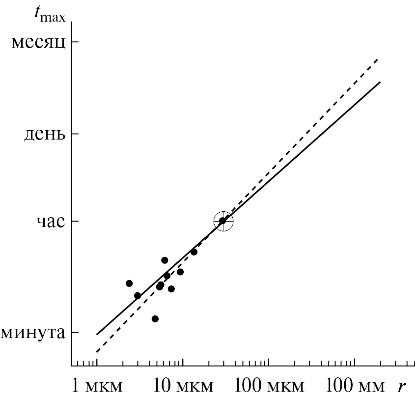 Оценка времени достижения максимальной скорости (рис. 2) прогнозирует, что в микронных каплях максимум скорости достигается в течение нескольких минут, в субмиллиметровых каплях tmax возрастает до суток и более, с увеличением размера капель величина tmax становится бессмысленно большой.