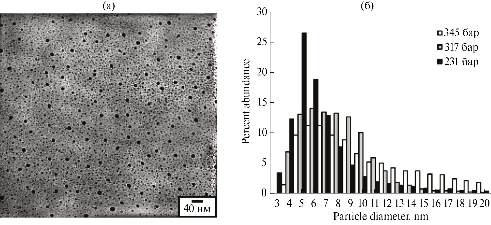Рис. 2. Электронная микрофотография медных наночастиц при синтезе методом СКФ/обратные мицеллы (а) и распределение по размерам частиц меди при давлении пропана 345 (1), 317 (2) и 241 бар (3) [37] (б).