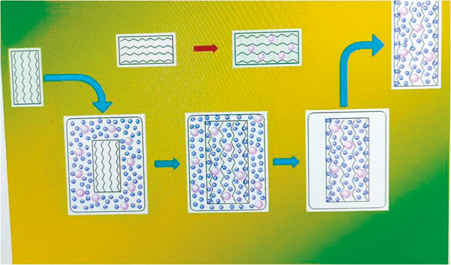Резюмируя, можно отметить, что при использовании различных методик и подходов среда сверхкритического СО2 благодаря своим уникальным свойствам – низкому коэффициенту поверхностного натяжения и высокому коэффициенту переноса в ней целевых компонентов может эффективно использоваться для создания композиционных материалов, в том числе и на основе нерастворимых соединений и наноразмерных объектов. В представленных работах было также показано, что при комбинировании традиционных методов с СКФ-обработкой можно получать композиционные материалы, содержащие объемные нанообъекты (такие как УНТ и НДГ) и имеющие хорошие механические свойства. На рис. 5 в качестве примера показана схема импрегнации и модификации полимеров в среде сверхкритического СО2 [42].