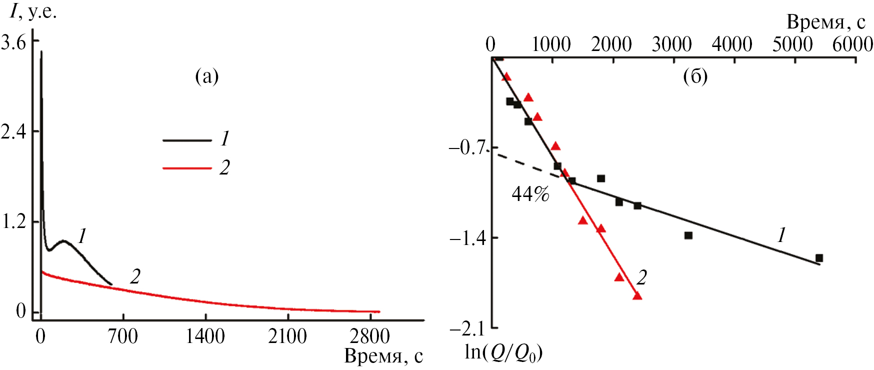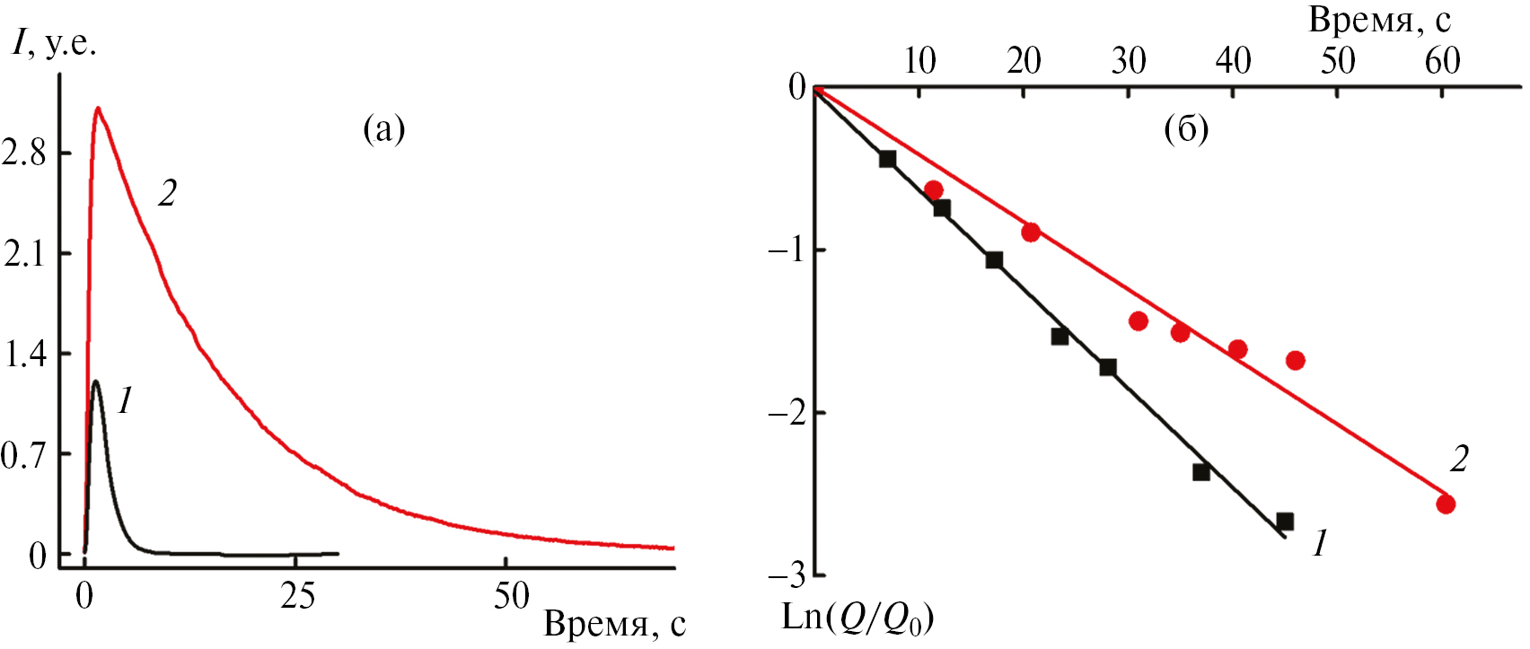 Рис. 4. Кинетика испускания хемилюминесценции в течение ПО-реакции (a) и гидролиза (б) для БТЭЭ-оксалата (1) и CPPO (2) в мицеллах сополимеров мПЭГ‒блок‒поли-L-лактид61 при концентрации полимера 7.5 мг/мл, 4.5 × 10–4 моль/л каждого оксалата, 1 × 10–4 моль/л перилена и 4 × 10–4 моль/л H2O2, PBS, 37 °C