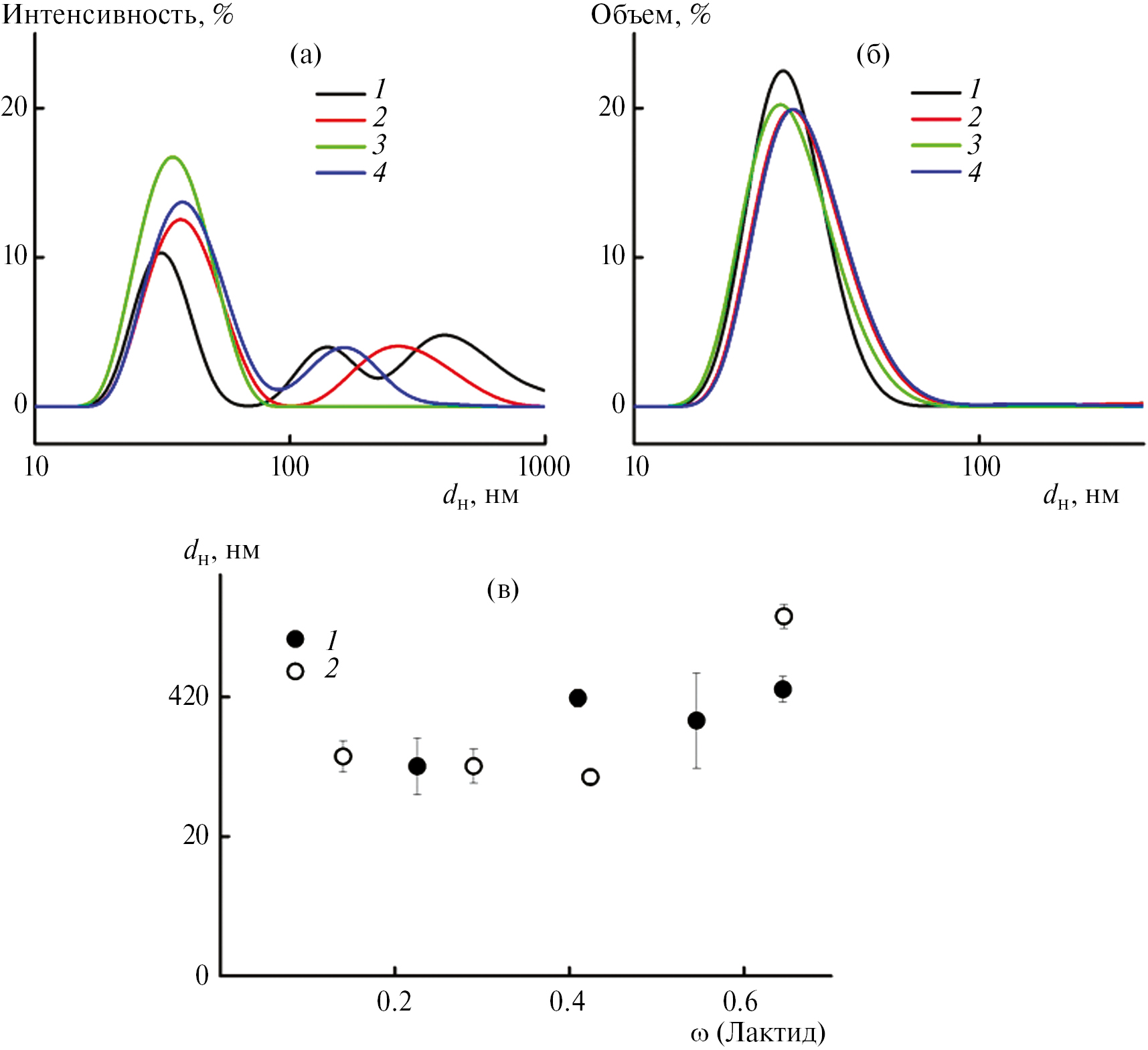 Учитывая нелинейную зависимость интенсивности рассеивания от размера частиц, определенных с помощью светорассения, распределение было пересчитано с учетом объема рассеивающих частиц (рис. 3б). В этом случае наблюдался только один пик, средний размер которого немного увеличивался с ростом степени полимеризации полилактидного блока (рис. 3в).