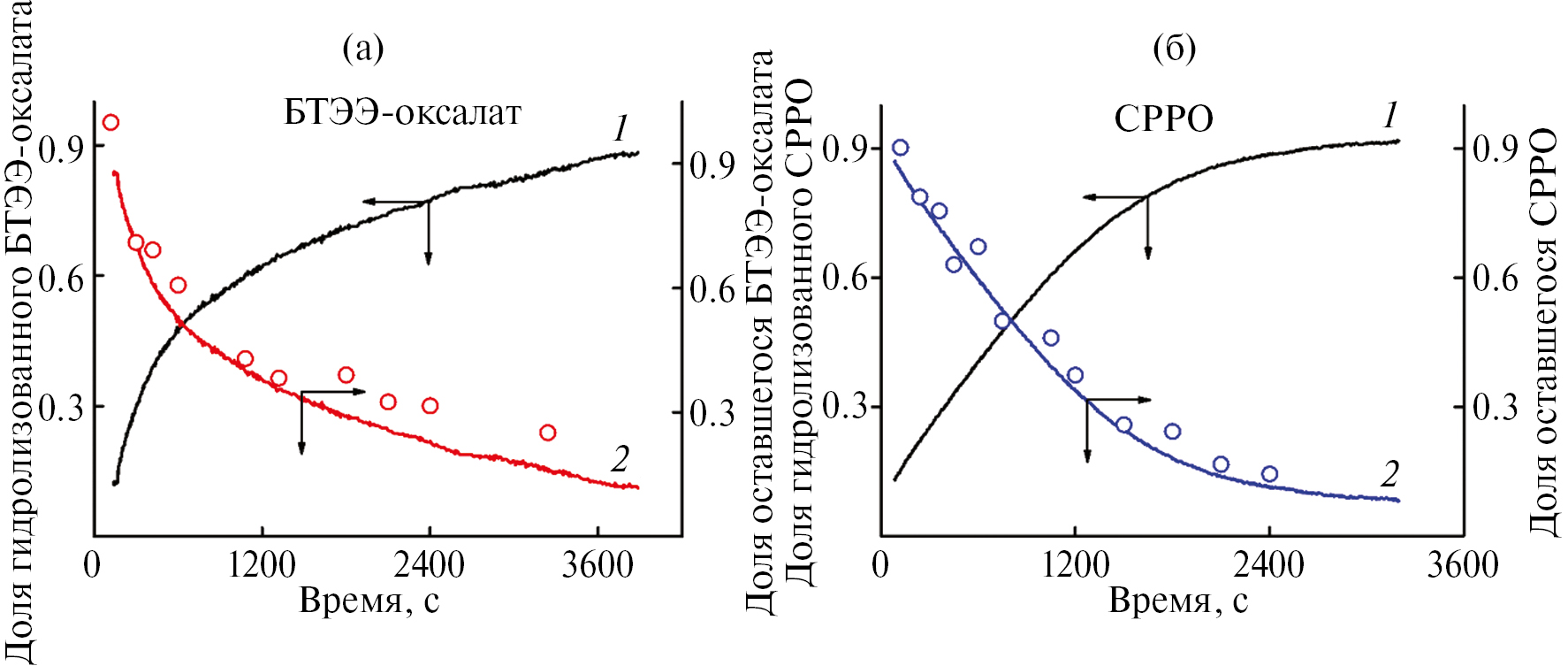 Рис. 5. Кинетика гидролиза БТЭЭ-оксалата (а) и CPPO (б), измеренная с помощью потенциометрического титрования (1) в условиях, приведенных в подписи к рис. 4. На левых осях указаны доли гидролизованного оксалата, рассчитанные из количества добавленного NaOH нормированного на количество оксалата в образце, на правых осях ‒ количество оставшегося оксалата. Светлые точки соответствуют данным рис. 4, полученным из интегральной интенсивности ПО-реакции