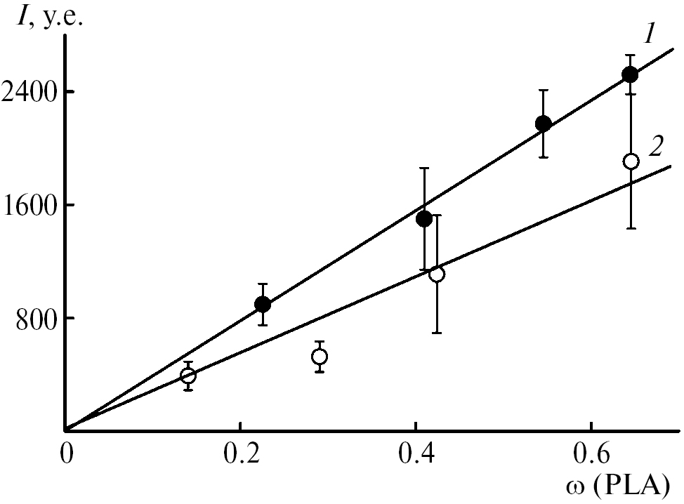 Рис. 6. Зависимость интегральной интенсивности ПО-реакции в мицеллах сополимеров мПЭГ‒блок‒поли-L-лактид (1) и мПЭГ‒блок‒поли-D,L-лактид (2) от массовой доли ω полилактидного блока. Концентрация БТЭЭ-оксалата 4.5 × 10–4 моль/л, перилена 1 × 10–4 моль/л