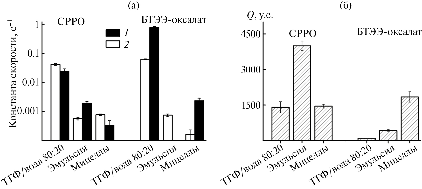 Таким образом, включение оксалатов и активатора в эмульсии и мицеллярные нанореакторы замедляет гидролиз оксалатов и стадию циклизации в ПО-реакции (рис. 7а). Это может быть следствием как уменьшения локальной концентрации пероксида водорода и воды, так и константы гидролиза из-за дестабилизации переходного состояния в неполярном окружении [38].