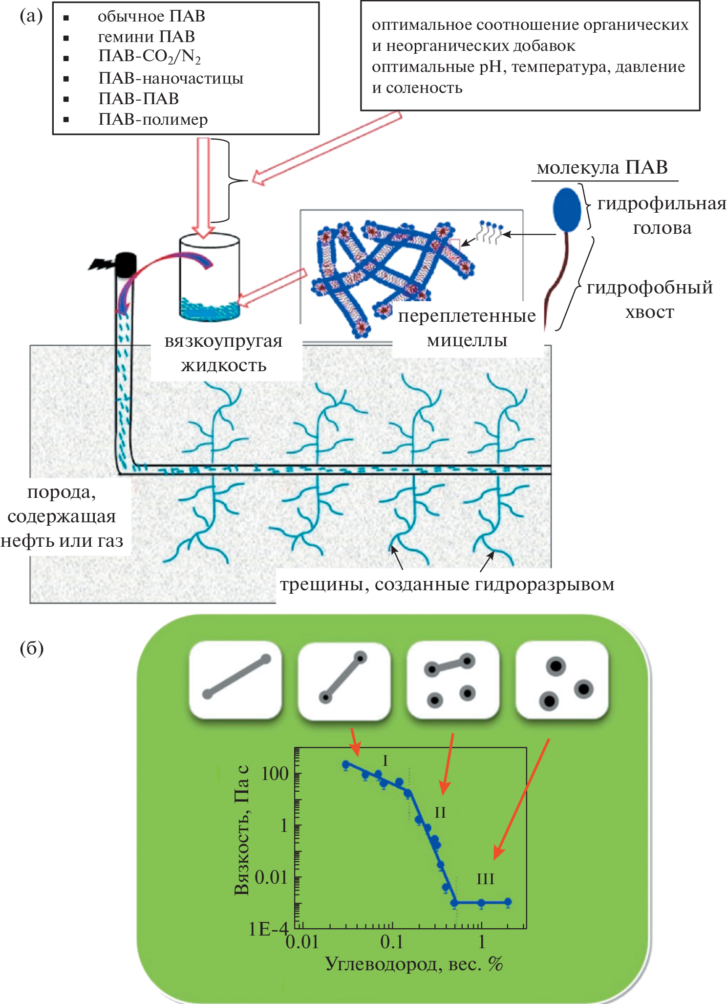 Растворы на основе полимероподобных мицелл ионогенных поверхностно-активных веществ привлекают внимание ученых как стимул-чувствительные системы, которые могут переходить из состояния низковязкой ньютоновской жидкости к вязкоупругим растворам с вязкостью до 10 кПа с и упругим откликом. Форма мицелл и их длина определяются балансом гидрофобных и электростатических взаимодействий, поэтому с помощью добавок различных низкомолекулярных веществ или функциональных наночастиц можно значительно изменять реологические свойства таких растворов и придавать им новые стимул-чувствительные свойства. В данном обзоре представлены наиболее часто используемые способы управления свойствами многокомпонентных растворов червеобразных мицелл поверхностно-активных веществ, в том числе нанокомпозитных систем. Описаны современные области практического применения таких систем и перспективы их развития.