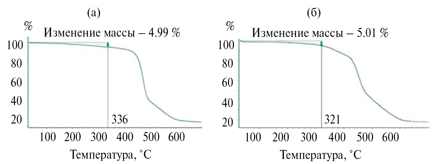 Термогравиметрический анализ образцов проводили в динамическом режиме в диапазоне от 20 до 700 °С с применением системы “TG50 Mettler Toledo” с точностью определения массы образца до 1 мкг. Скорость нагревания составляла 10 град/мин в атмосфере воздуха и аргона.
