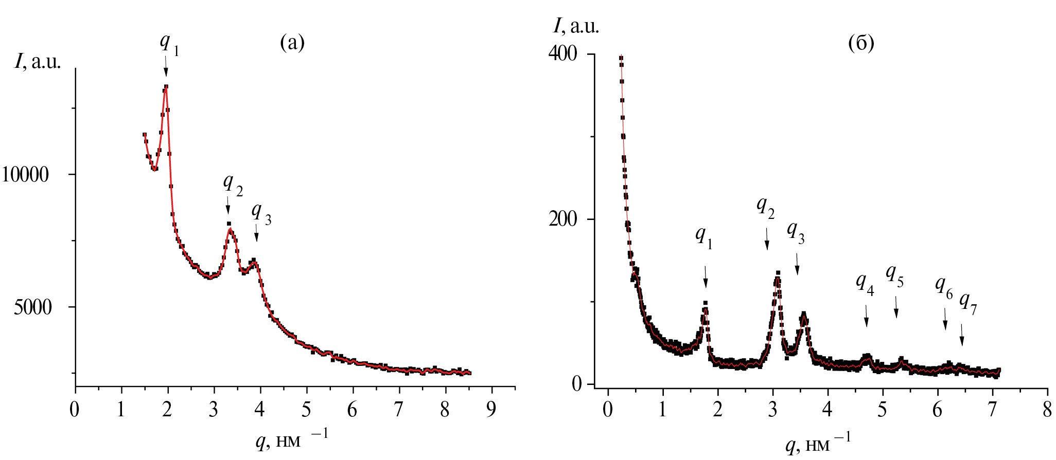 Так, авторы работы [19] предлагают осуществить интерполиэлектролитную реакцию на межфазной границе хлороформ‒вода. Гребнеобразный полиэлектролит pAUTA с противоионом толуолсульфонат при этом был растворен в воде (хлороформ для него является плохим растворителем). Aнионный полиэлектролит pAMPS (в составе полиэлектролит-коллоидного комплекса с додециламином) был растворен в хлороформе (для этого полимера вода служила плохим растворителем). Интенсивное перемешивание такой смеси приводило к моментальному формированию стехиометрического осадка ИПЭК. В растворе оставалась низкомолекулярная соль – толуолсульфонат додециламмония в стехиометрическом составе. Полученный в межфазных условиях ИПЭК имел кубическую упаковку согласно данным малоуглового рентгеновского рассеяния q1 : q2 : q3 : q4 : q5 = = 1 : (4/3)0.5 : (8/3)0.5 : (11/3)0.5 : (12/3)0.5 : (16/3)0.5 [21] (рис. 2). Очевидно, что на межфазной границе вода‒хлороформ, где, видимо, и происходила интерполиэлектролитная реакция, были созданы термодинамически плохие условия для каждого из полимеров, и гексагональная ориентация гребнеобразного полиэлектролита разрушалась.