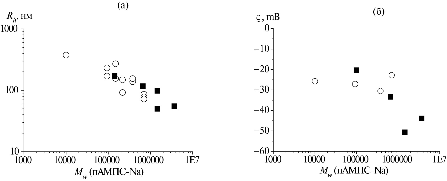 Очевидно, что в составе полиэлектролит-коллоидного комплекса pAMPS‒AUTA в воде подвижность и способность миграции молекул мономера от одной внутримолекулярной мицеллы к другой значительно ограничена, ведь помимо гидрофобных взаимодействий боковых хвостов AUTA молекулы объединены вместе ионными связями с макроанионом. Полимеризация в таких системах осуществляется при тщательной дегазации раствора, после синтеза изначально прозрачный раствор становится опалесцирующим. Стабилизирует такую частицу анионный полиэлектролит pAMPS. При низкой молекулярной массе стабилизирующего полиэлектролита частицы ИПЭК склонны к агрегации и обладают низкой стабильностью. Используя узкодисперсные фракции анионного полиэлектролита pAMPS, авторы работы показали, что с ростом молекулярной массы pAMPS гидродинамический радиус частиц ИПЭК уменьшается (рис. 3).