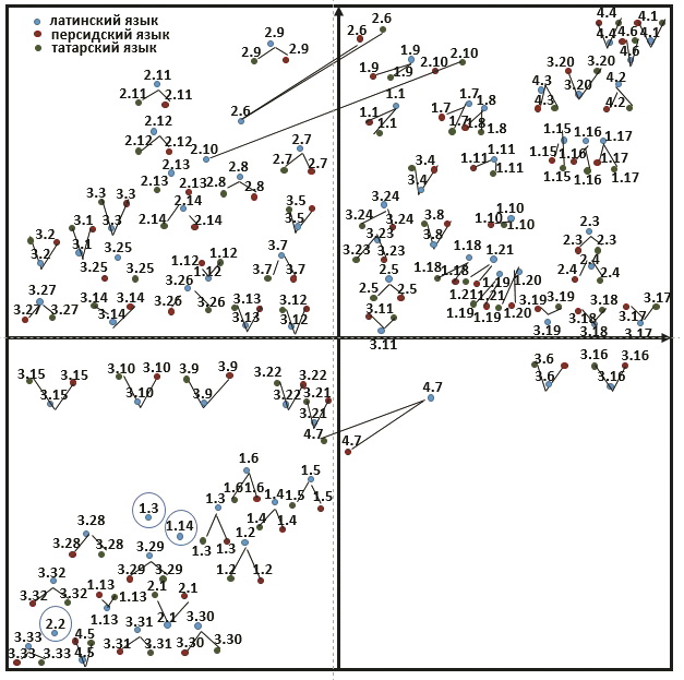 Не удивительно, что термины “libertas” (2.2), “murus” (1.3), “vacuum” (1.14) в силу их крайне отрицательного осмысления оказались вообще не переведенными на персидский и татарский языки; понятие “civitas” (2.1) начисто лишилось своего западного контекста; все эти категории заняли на ментальной карте третью четверть, соответствующую нечестию и несправедливости (Рис. 3). Лексемы “lex” (2.6) и “curia” (2.10) также оказались в левом поле, соотносившимся с несправедливостью, поскольку они представляли собой учреждения обычных горожан; им противостояло восточное видение закона и суда как посланных свыше божественной волей. Понятие “Deus” (4.1) было освоено в татарском мышлении через уподобление Тенгри, верховному божеству Неба всех кочевых народов Евразии. А вот термин “presbiter” (4.7) не нашел собственно тюркских аналогов, поскольку для тюркской культуры было противоестественным вторжение в частную жизнь кочевника, присутствие некоего надзирателя за моральной жизнью, с помощью разного рода санкций дисциплинировавшего прозелитов новой веры.