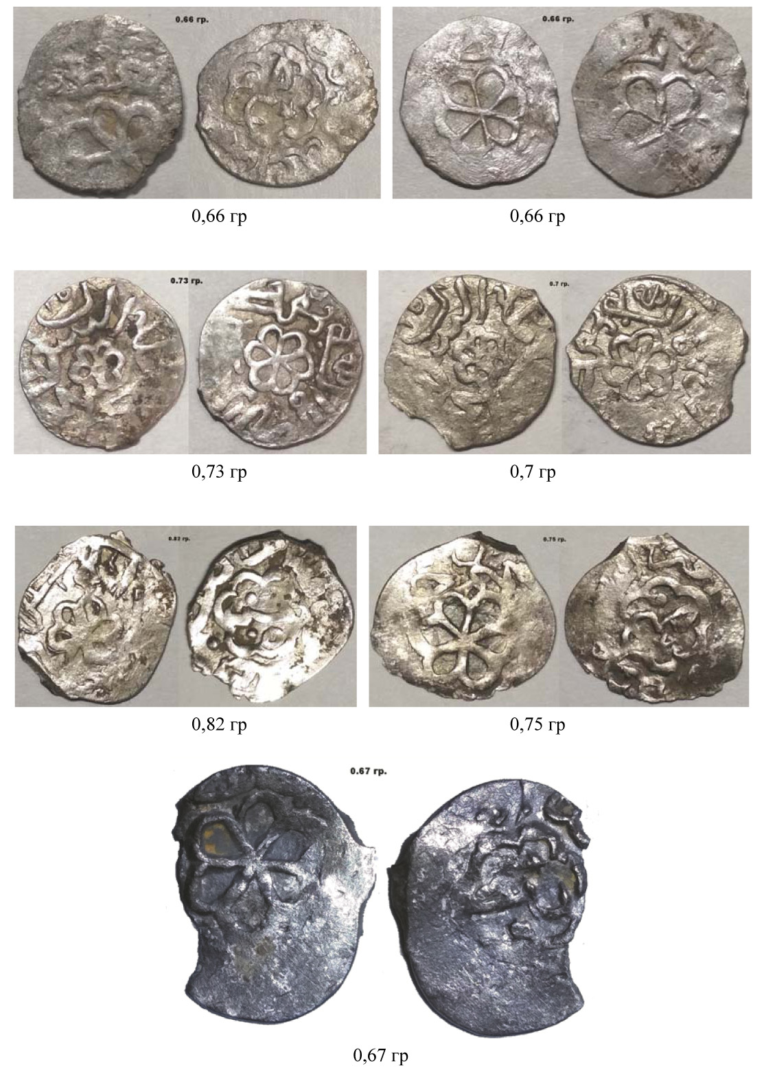 Серебро: Джучиды: Токтамыш: Сарай ал-Джедид 790 г.х. – 1 (1,32 г.); Азак ал-Мархуса г.(?) – 1 (1,25 г.); Кепек: Сарай – 2 (вес?); Дервиш: Хаджи-Тархан – 1 (0,92 г.); Мухаммед: место(?) без даты – 7 (0,66 -2; 0,67; 0,70; 0,73; 0,75; 0,82 г.); неопределенные джучидские монеты XV в. – 5 (0,75; 0,92, 0,93 г., вес? – 2); Гиреи: Хаджи-Гирей: чекан Крыма 886 г.х. – 1 (0,65 г.).