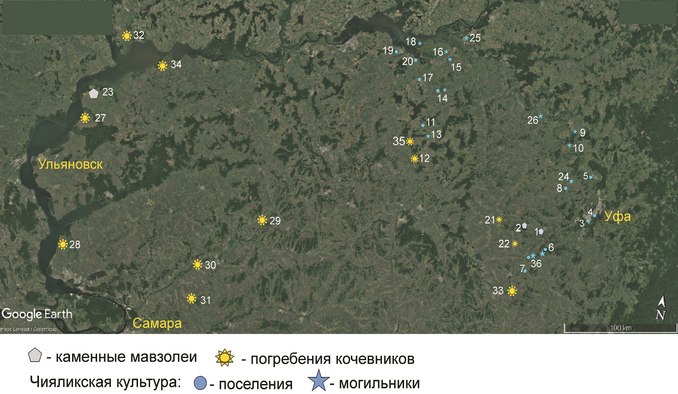 1 – Husein-bek; 2 – Tura-khan; 3 – Ufa II; 4 – Ufimskoye (Chortovo); 5 – Kara-Abyz; 6 – Gornovskoye I; 7 – Yabalaklinskoye; 8 – Podymalovskoye; 9 – Biktimirovskiy; 10 – Kazaklarovskiy; 11 – Mellyatamakskoye; 12 – Bayryaki-Tamak; 13 – Nagaybakskiy; 14 – Chiyalikskiy; 15 – Taktalachukskiy; 16 – Azmetyevskiy; 17 – Igimskoye; 18 – Derbeshkinskiy; 19 – Usayevskoye; 20 – Bikbulovskoye; 21 – Syntyshtamakskiy; 22 – Udryakbash; 23 – mausoleums of Bulgar; 24 – Taganayevskiy; 25 – Sauzovskiy; 26 – Kushulevskiy; 27 – Balymerskiy; 28 – Svkh. Lunacharskogo; 29 – Bolshoy Shikhan; 30 – Aleksandrovskiy; 31 – Pokrovka; 32 – Rozhdestvenskiy IV; 33 – Akkulayevskoye; 34 – Alekseyevskoye; 35 – Urmanayevskoye; 36 – Nizhnekhozyatovskoye