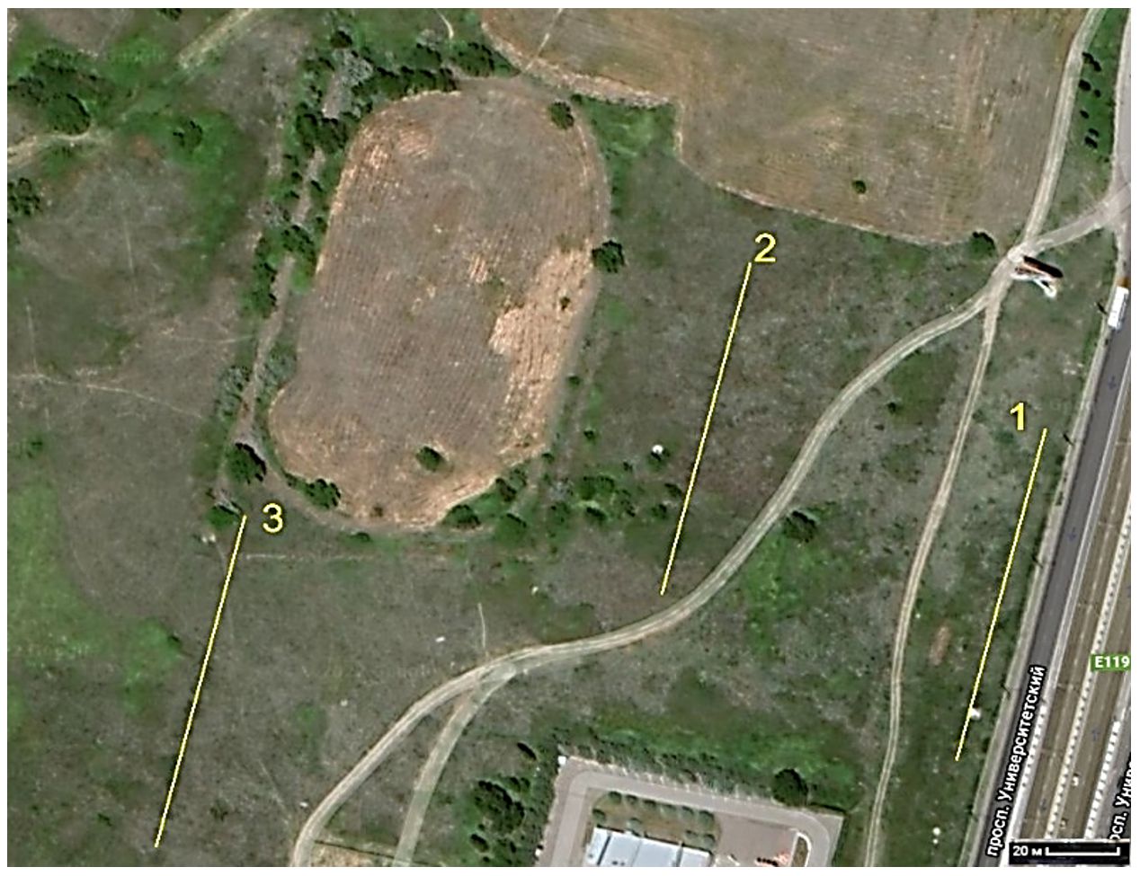 На ключевом полигоне «2-я Продольная» преобладает степная травянистая растительность. Непосредственно возле автомагистрали доминировали полыни (Artemisia spp.), горец птичий (Polygonum aviculare L.). По мере удаления от дороги растительность сменялась пыреем ползучим (Elytrigia repens (L.) Nevski), житняком гребенчатым (Agropyron cristatum (L.) Gaertn.), овсяницами (Festuca spp.) и пр. Древесная растительность присутствовала в виде отдельных деревьев вяза (Ulmus sp.), лоха (Elaeagnus sp.). Расположение почвенных ловушек на полигоне «2-я Продольная автомагистраль» представлена на рисунке 2.