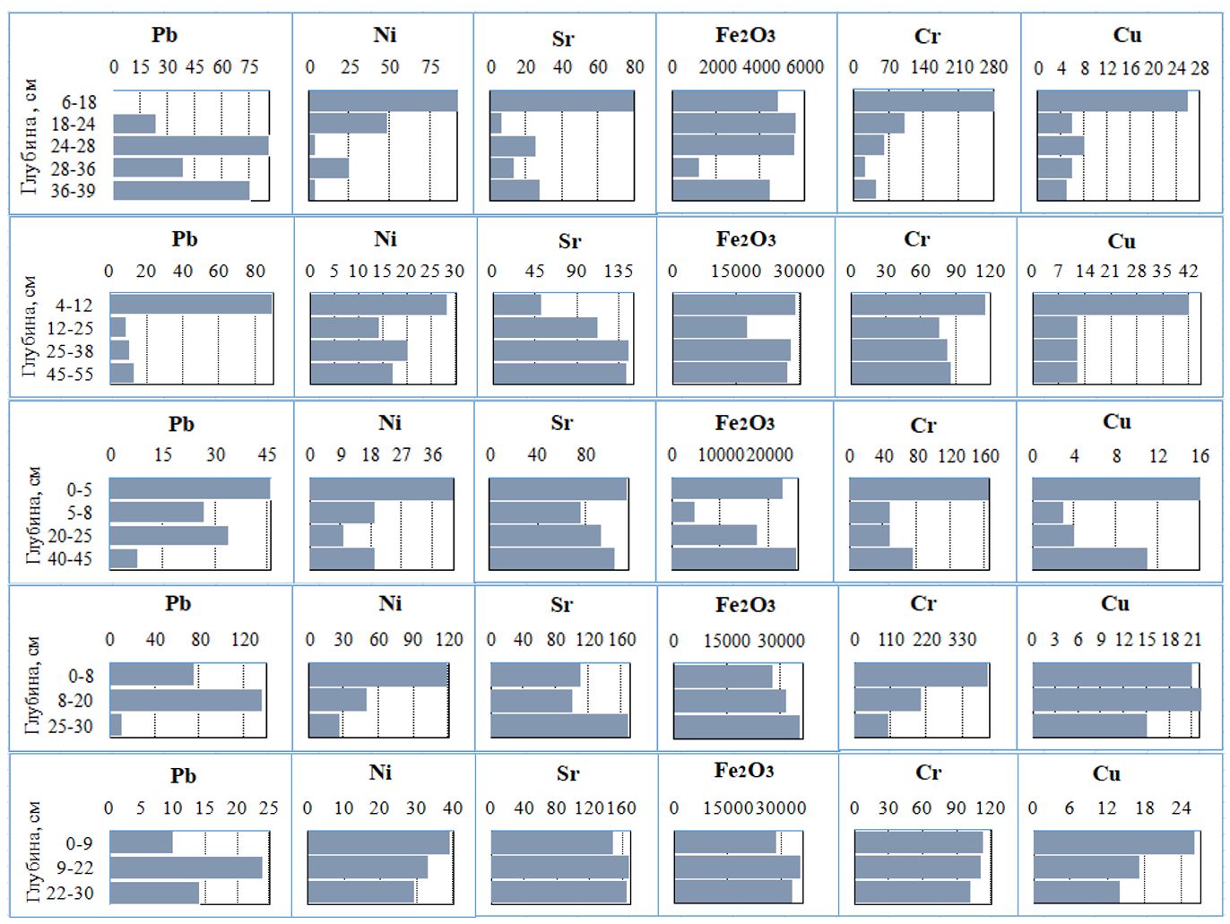 Радиальная почвенно-геохимическая структура криоземов совмещает черты элювиально-иллювиальной дифференциации и биогенной аккумуляции. Содержание халькофильных Pb и Cu имеет ярко выраженный поверхностно аккумулятивный характер, в то время как Fe, Ni, Cr имеют слабоконтрастное элювиально-иллювиальное распределение. В подзолах распределение всех элементов элювиально-иллювиальное, с минимумом в горизонте E. Для озерно-аллювиальной почвы основным процессом является осаждение илистых частиц на поверхности при весеннем повышении уровня воды в озере, что приводит к росту содержания в поверхностном горизонте Ni, Cr, Cu, Sr. Распределение Ni очень контрастное (0,2<R<23).