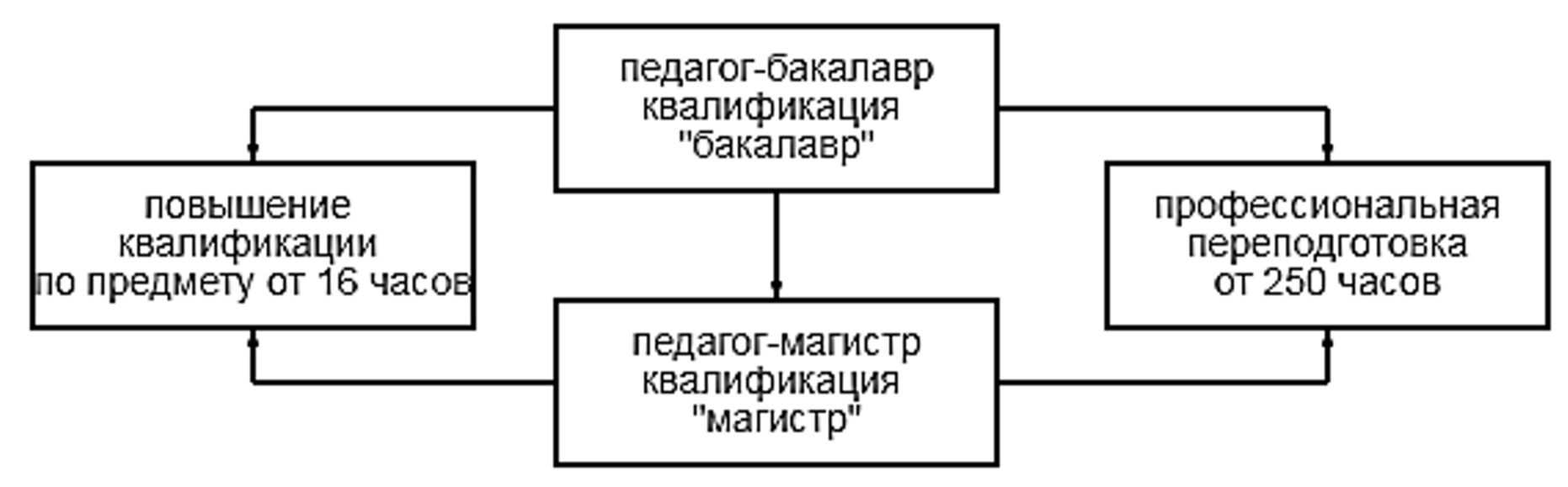 Реализация системы непрерывного образования связана с повышением педагогического мастерства на основе достигнутого уровня квалификации: установлены возможные педагогические траектории для выпускников бакалавриата и магистратуры. Каждому уровню квалификации доступны определённые педагогические должности: выпускнику бакалавриата – учителем в школе или преподавателем СПО, высший уровень связан с возможностью получения высшей категории и дополнительной категории; для выпускника магистратуры доступна также возможно работы в высшей школе с возможностью профессионального роста и получения учёной степени и учёного звания.