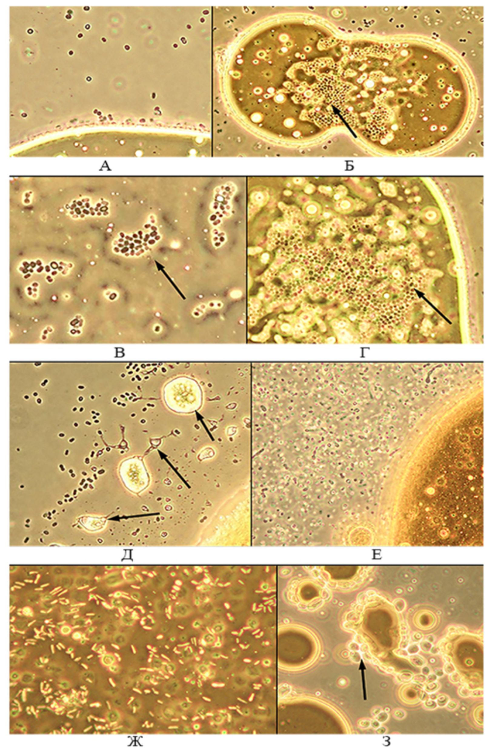 Пояснения к рисунку 2: А – сорбция клеток деструктора на поверхности микрокапли нефти; Б, В, Г – развитие биопленки клеток деструкторов на каплях нефтяной суспензии; Д – активная утилизация нефти, стрелками указаны уменьшающиеся капли эмульсии и их остатки; Е – резко возросшая концентрация планктонных клеток штамма Acinetobacter sp. Sp-18 к окончанию срока культивирования; Ж – клетки нефтедеструктора Rhodococcus sp. Sp-116, сорбированные на поверхности микрокапли нефтяной суспензии; З – клетки нефтедеструктора Yarrowia lipolytica Y-979, утилизирующие нефтяную суспензию.