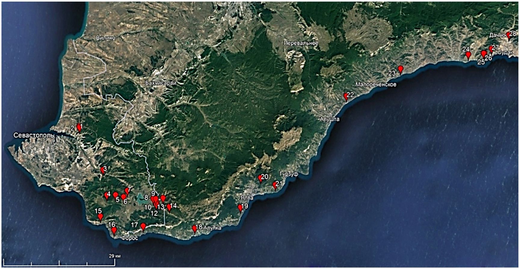 (1–2 – окрестности г. Инкерман; 3 – г. Чирка-Каясы; 4 – г. Каяташ; 5 – г. Кучук-Коль-Бурун; 6 – окрестности с. Широкое; 7 – г. Самналых; 8–9 – г. Курт-Кая; 10–12 г. Кара-Даг; 13 – г. Толака-Баир; 14 – г. Тарпан-Баир; 15 – ур. Батилиман; 16 – г. Сарыч; 17 – г. Дракон; 18 – г. Кошка; 19 – г. Крестовая; 20 – окрестности пгт. Массандра; 21 – м. Мартьян; 22 – б. Семидворская; 23 – г. Япул-Бурун; 24 – г. Папая-Кая; 25–26 – г. Коба-Кая; 27 – г. Сокол; 28 – г. Каршитерс)
