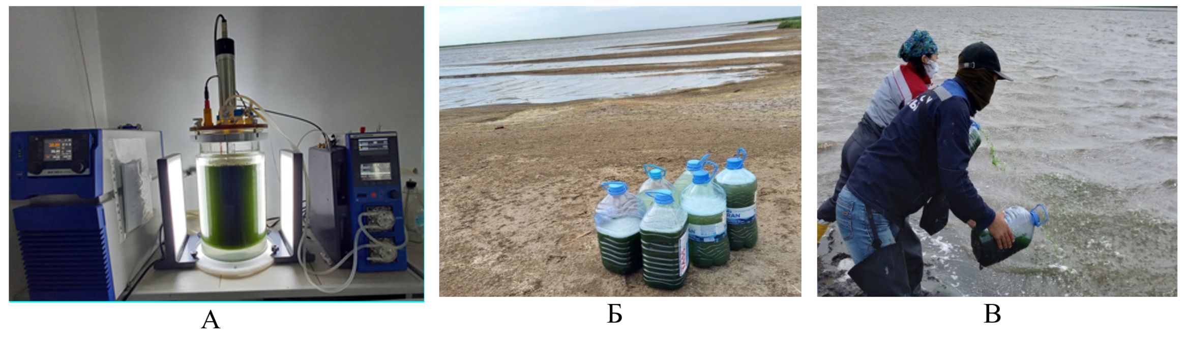 Для проведения альголизации озера Майбалык предварительно была проведена наработка опытной партии консорциума микроводорослей У1+И2 с помощью фитобиореактора IКA (10 Control, Германия) общим объемом 10 л на питательной среде Тамия.