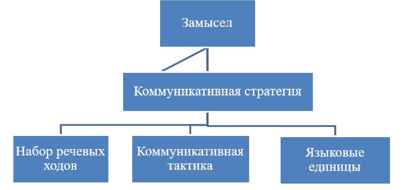 Мнения авторов совпадают в толковании коммуникативных стратегий как долгосрочного плана, однако различаются в суждении о содержании этого плана и методологии планирования коммуникации. В системе коммуникации коммуникативная стратегия является центром, в ней сосредоточена направленность на реципиента и учет особенностей возможного восприятия текста. В отличие от замысла, который находится над коммуникативной стратегией и является только выражением мыслей автора и не берет во внимание фоновые знания аудитории, коммуникативная стратегия располагает инструментарием разного порядка. Первое – это набор речевых ходов, который выбирается исходя из большой цели автора. Второе – конкретная коммуникативная тактика – отдельный речевой ход, который наиболее воздействует на читателя и замечается им. Третье – языковые единицы, обслуживающие речь. Структуру коммуникативной стратегии можно представить в виде схемы на рисунке 1.
