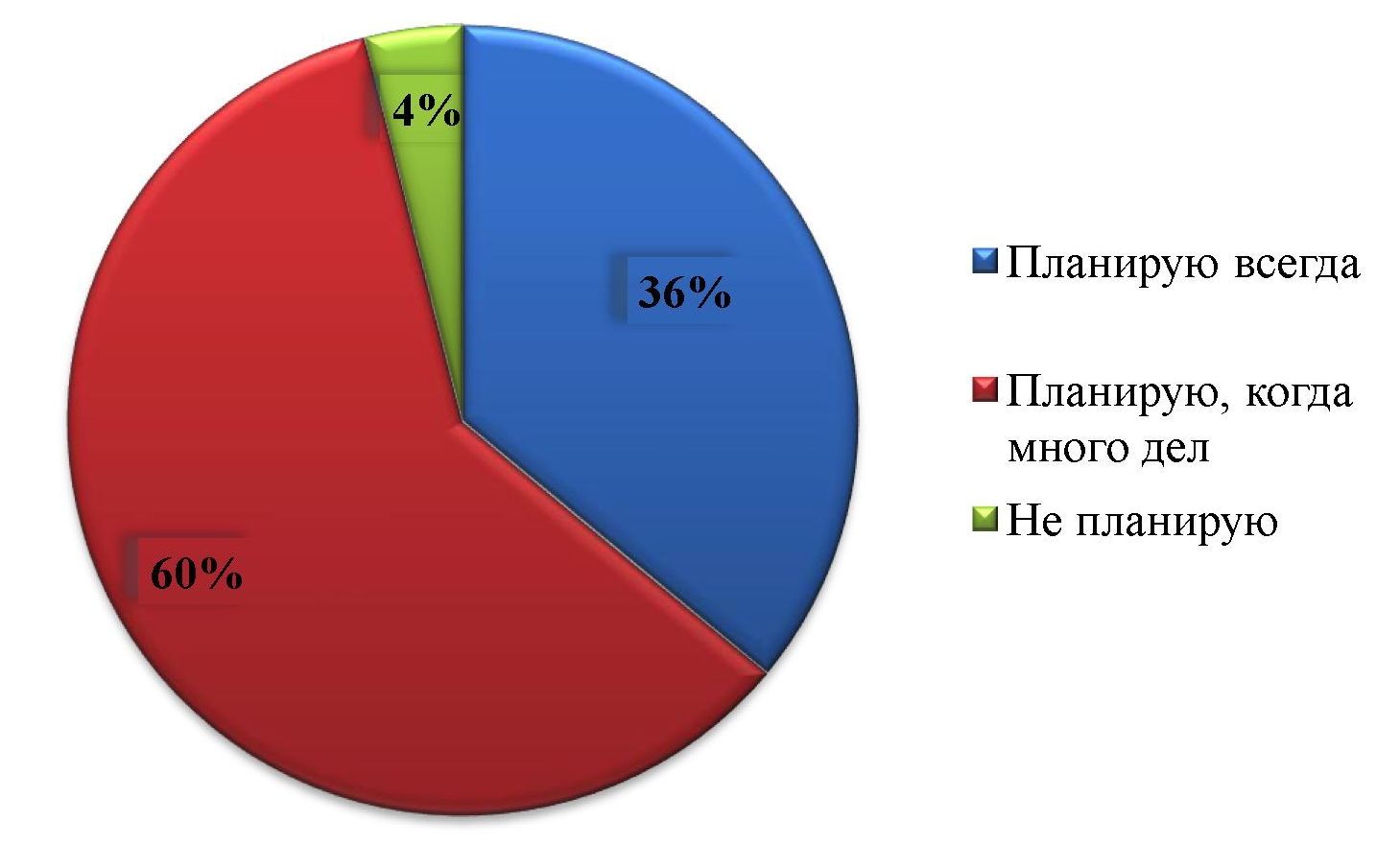 В результате проведённого анализа ответов на данный вопрос было получено, что большая часть студентов (60%) планирует своё время лишь при необходимости, т.е. тогда, когда нужно сделать много дел. 36% ответивших всегда планирует своё время, и лишь малая часть, а именно 4% (1 студент) не планирует своё время.