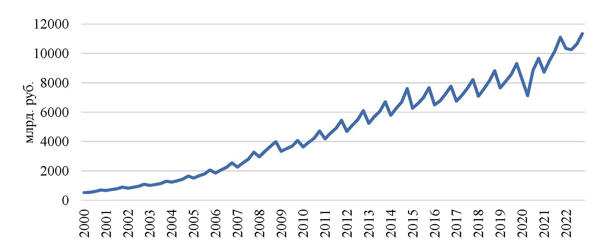 Рис. 1. Поквартальная динамика оборота розничной торговли в Российской Федерации за 2000–2022 гг. (в текущих ценах), млрд. руб.