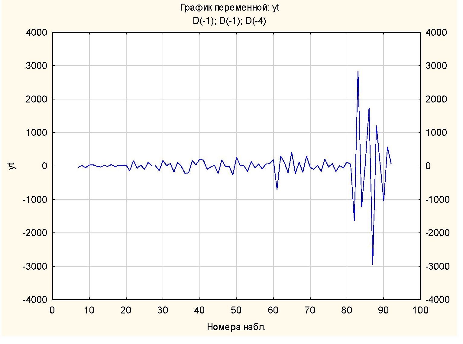 Моделирование временного ряда оборота розничной торговли на основе сезонной ARIMA-модели было осуществлено с помощью ППП «Statistica 6.0». Так как временной ряд содержит параболический тренд и квартальную сезонность, то порядок простой разности равен двум, а сезонной – единице. Преобразованный ряд разностей, представлен на рисунке 2.