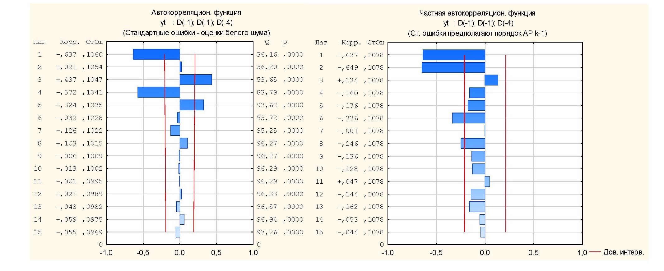 Для идентификации порядков авторегрессии и скользящего среднего были рассмотрены графики автокорреляционной и частной автокорреляционной функций преобразованного ряда разностей (рис. 3).