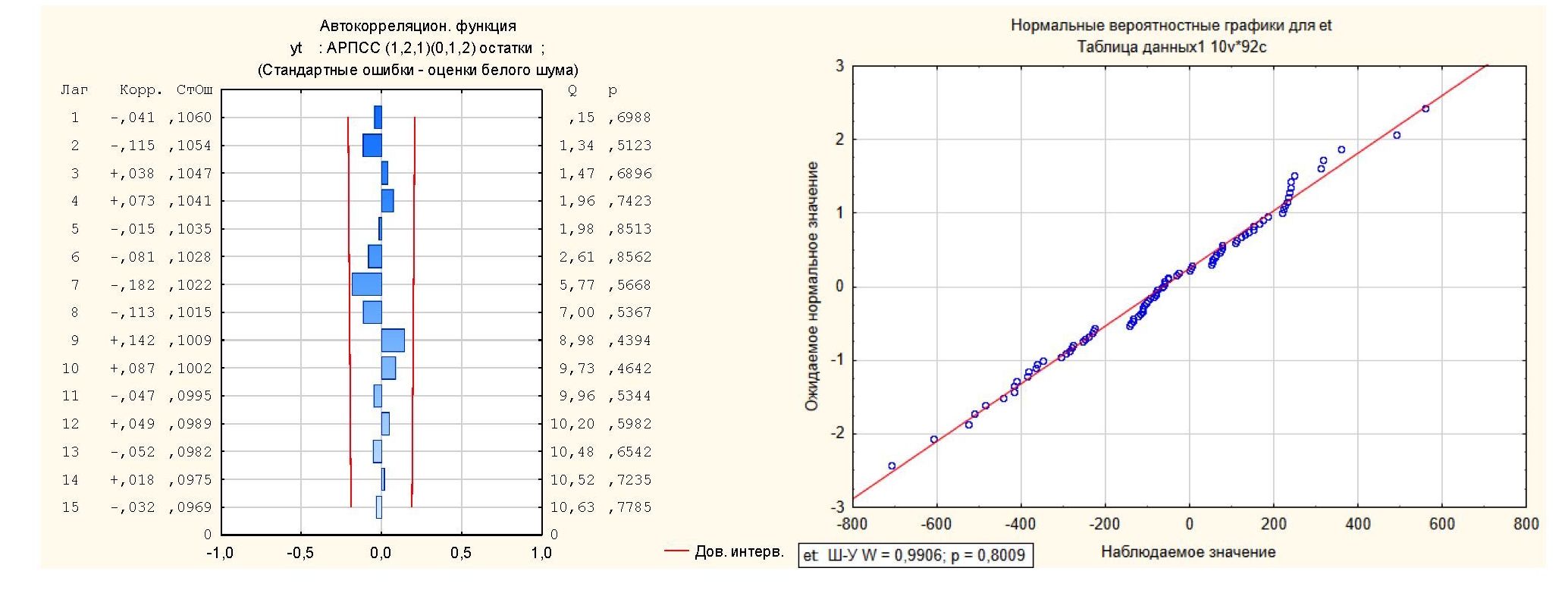Рис. 4. График автокорреляционной функции остатков и нормальный вероятностный график по остаткам сезонной ARIMA-модели порядка (1, 2, 1) × (0, 1, 2)4.