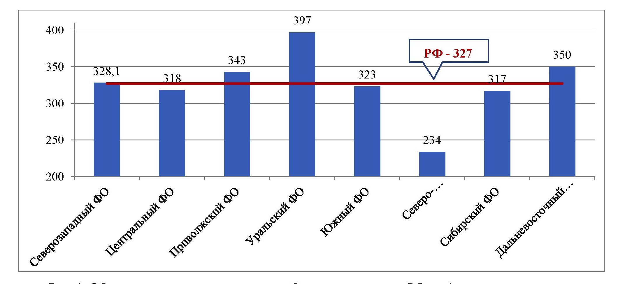 Рис. 1. Обеспеченность легковыми автомобилями населения в РФ по федеральным округам в расчете на 1 000. человек населения по состоянию на 1 января 2023, авто.