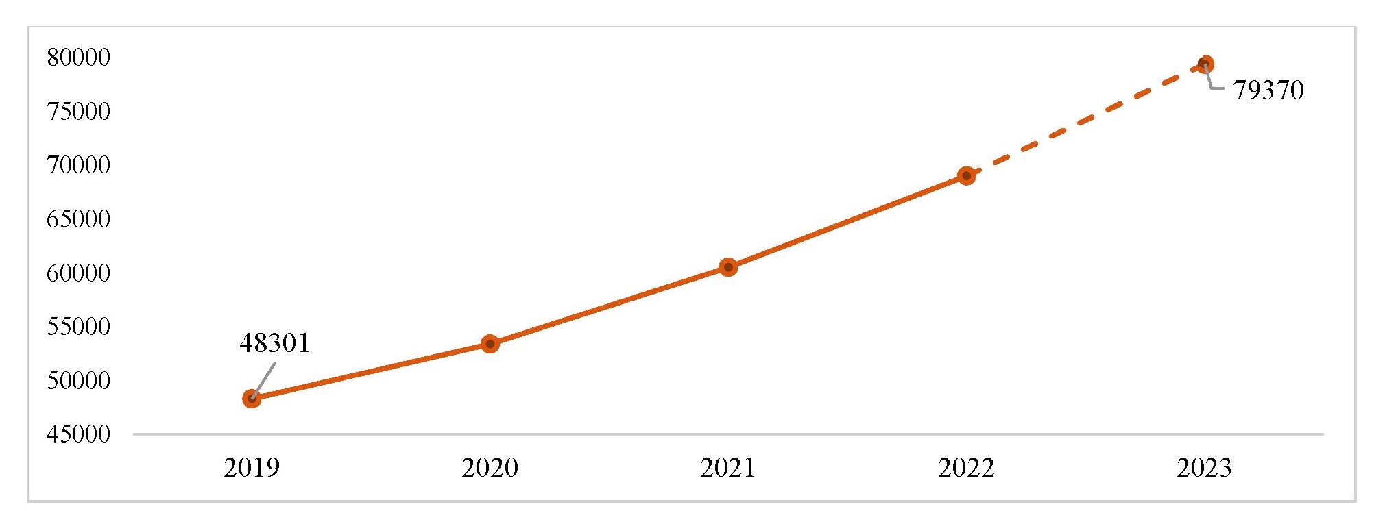 Рис. 3. Динамика среднемесячной номинальной начисленной заработной платы работников сферы образования в Российской Федерации за 2019–2023 гг.