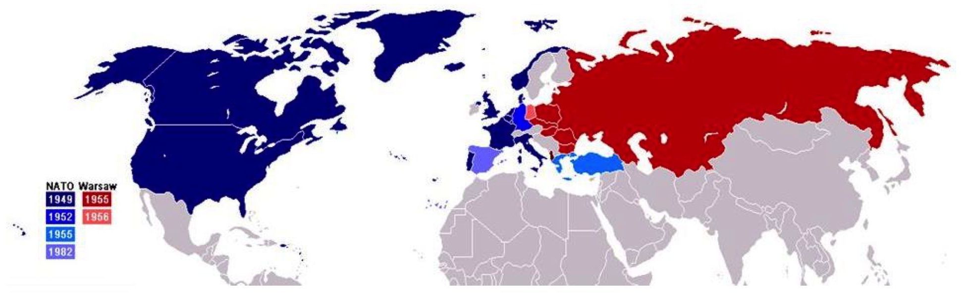 Рис. 2. Страны, входящие в НАТО и ОВД до 1990–х гг. (синим цветом обозначены страны, входящие в НАТО, красным – в ОВД) [2].