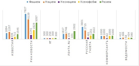 Перейдем непосредственно к анализу крупных электронных изданий РФ. В качестве таковых были выбраны «Известия», «РИА Новости», «RT», «Лента.ru», «Русская Газета», «КоммерсантЪ» и «Ведомости». В этих СМИ в рамках убеждающей коммуникации используются понятия «нацизм», «фашизм», «неонацизм» и др. В целом, можно выделить 4 группы по упоминанию тех или иных формулировок: а) первая группа ссылается в своих речах на «фашизм»; б) вторая группа преимущественно опирается на «нацизм»; в) третья группа акцентирует внимание на «неонацизм»; г) четвертая группа способна употреблять ключевые слова рядом, смешивать категориально непохожие понятия, что провоцирует утрату отличительных черт, размывание границ между понятиями, когнитивный диссонанс в массовом сознании (реципиентов информации).