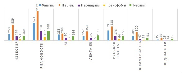 Таким образом, за ближайший год федеральные информационные ресурсы стали намного чаще использовать в своих материалах слово «нацизм», тогда как «фашизм» ушло на второе место. Также СМИ за предыдущий год стали уделять внимание больше «неонацизму», однако уровень упоминаний данного термина не превысил уровень «расизма». «Ксенофобия» опустилась с четвертого пункта до пятого.