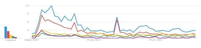 Далее будет целесообразным рассмотреть уровень частоты поисковых запросов ключевых слов в сети Интернет среди жителей Российской Федерации. В качестве основополагающего поискового сайта была выбрана платформа «Google». С помощью опции «Google Trends» возможно сравнивать между собой задаваемые поисковые индикаторы, отслеживать динамику их популярности: уровень интереса к теме по отношению к наиболее высокому показателю в таблице для определенного региона и периода времени. 100 баллов означают наивысший уровень популярности запроса, 50 – уровень популярности запроса, вдвое меньший по сравнению с первым случаем. 0 баллов означает местоположение, по которому недостаточно данных о рассматриваемом запросе.