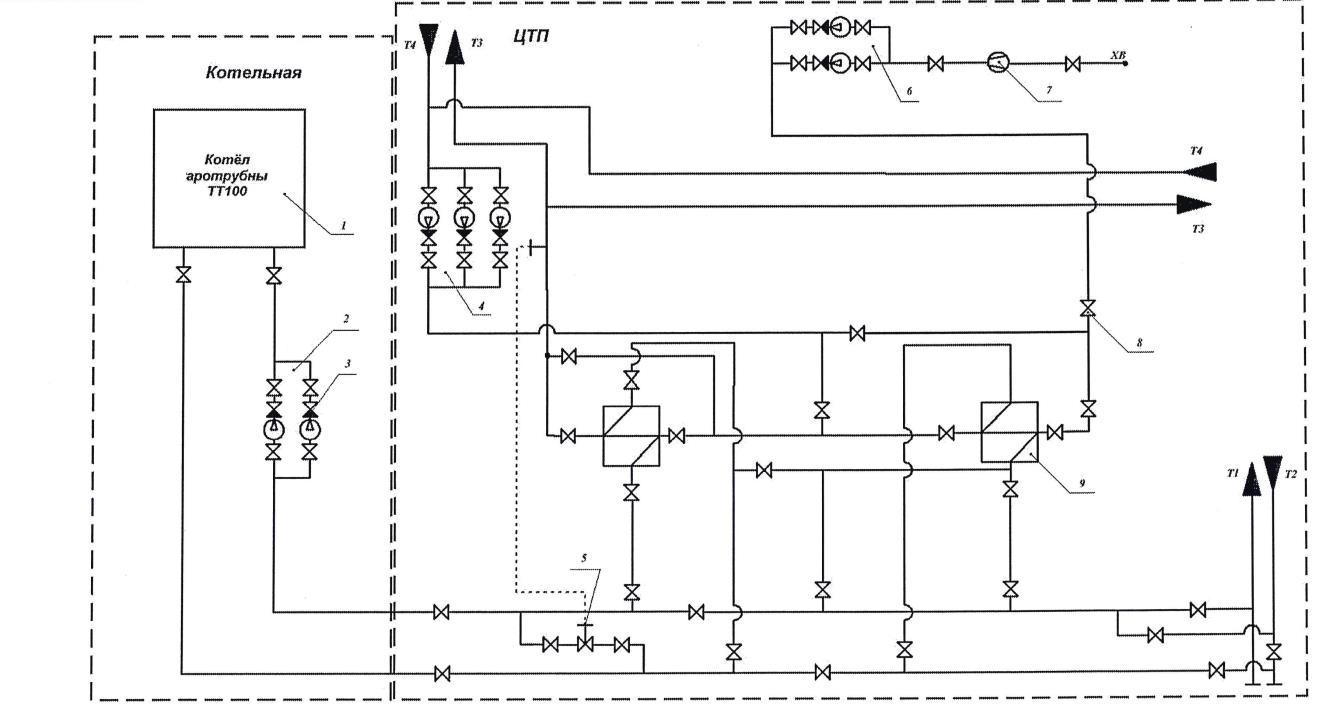 Рис. 1. Тепловая схема системой управления температуры горячей воды: 1 – котел жаротрубный ТТ-100; 2 – насос сетевой К160/30; 3 – обратный клапан; 4 – насос циркуляционный К290/30; 5 – регулятор давления, РР-НО-100(0,1-0,63); 6 – насос повысительный К65-50-160; 7 – электромагнитный преобразователь расхода; 8 – запорная арматура; 9 – теплообменник ВВП 16-325-4000.