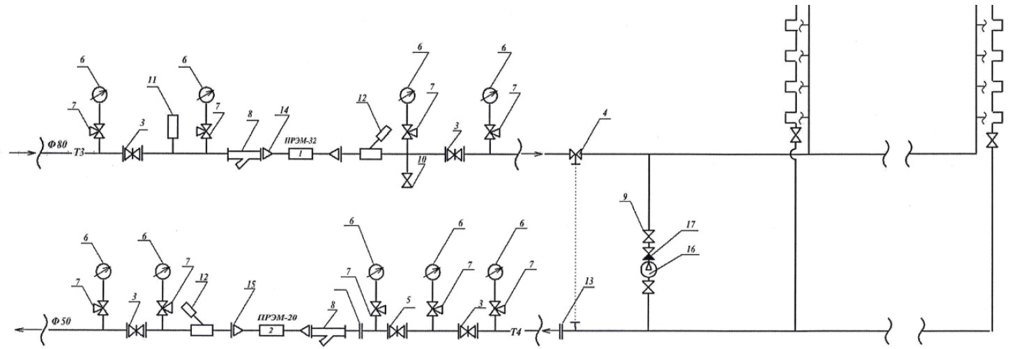 Рис. 2. Схема теплового узла системы ГВС жилого дома: 1-первичный преобразователь расхода Ду32; 2-первичный преобразователь расхода Ду20; 3-задвижка чугунная фланцевая Ду50; 4-регулятор давления Ду32; 5-обратный клапан Ду50; 6-монометр; 7-кран; 8-фильт магнитно-механический Ду50; 9-кран шаровой Ду32; 10-кран спускной; 11-термометр; 12-15 фитинги; 16-насос циркуляционный DAB VA 35/180; 17-обратный клапан Ду32.