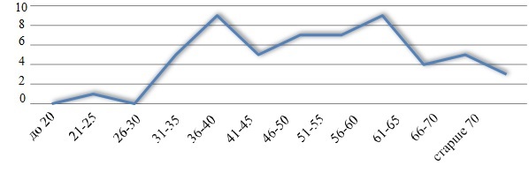 Основные подъемы заболеваемости АБП в анализируемой группе приходились на 2 возрастные группы: от 31 до 40 лет и от 51 до 60 лет (рис. 3).