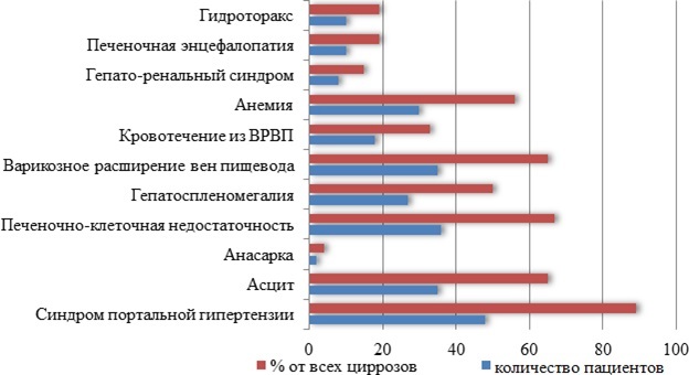 В дальнейшем нами была изучена частота встречаемости осложнений цирроза печени у госпитализированных больных. Наиболее частыми осложнениями стали: синдром портальной гипертензии, печеночно-клеточная недостаточность, варикозное расширение вен пищевода и асцит (рис. 4).