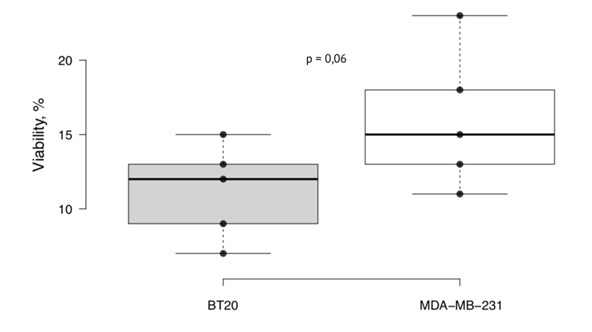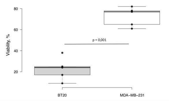 Рис. 2. Зависимость цитотоксического действия соединения ЛХТ-17-19 в концентрации 4,8×10-5 М в линейных координатах при культивировании культурах клеток рака молочной железы человека ВТ20 и MDA-MB-231; по оси ординат – процент выживших клеток в тесте МТТ; достоверность различий определена с использованием критерия Манна-Уитни.