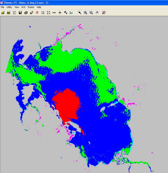 К сожалению, отсутствие данных регулярных гидрологических наблюдений не позволяет высказать каких-либо обоснованных предположений о причинах развития в этой акватории столь специфичных водных масс. Результат дешифрирования космического снимка представляет собой своего рода «априорную» классификацию, при которой не известны гидрологические, гидрохимические, гидробиологические и прочие особенности водных масс, но фиксируется особый спектральный образ отражения электромагнитных волн различной длины, приходящих от Солнца.