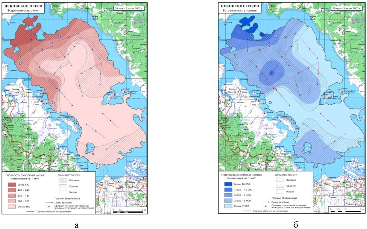Помимо фиксации пространственно-временных особенностей распределения рыб по акваториям, существенная роль в зооэкологическом картографировании принадлежит картам, отражающим систему природных и антропогенных факторов, определяющих, в том числе, и условия обитания ихтиофауны. Настоящее исследование и посвящено результатам картографического моделирования пространственно-временных особенностей распределения преимущественно промысловых видов рыб на примере Псковско-Чудской озерной системы. Методические особенности разработки серии карт опубликованы ранее [13], но в этой статье необходимо представить своеобразие технологий именно картографического моделирования на основе результатов траловых натурных работ.