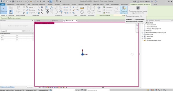Приступим к настройке проекта. Сначала сделаем видимыми точки координат проекта. Для этого войдем в режим Скрытые элементы и, выделив точки, нажмем на кнопку Показать категорию на вкладке Показ скрытых элементов (рисунок 1). Чтобы убедиться, что внутренняя точка проекта находится там же, где и точки координат, создадим скрипт (с англ. Сценарий). При формировании скриптов можно обращаться к внутренней системе координат, создавая объекты в точке начала координат или в любом месте пространства проекта. Также в эталонном файле необходимо создать оси (пересечение осей А-1), либо пересечение опорных плоскостей. По заданным объектам, впоследствии, будут выравниваться другие файлы.