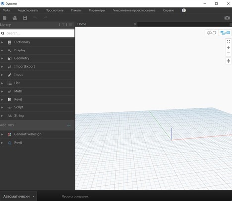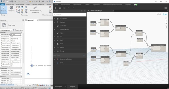 Для создания скрипта перейдем на вкладку Управление и выберем DYNAMO, так как скрип будет создаваться заново. Необходимо отметить, что в Revit также предусмотрен Проигрыватель Dynamo, который позволяет управлять готовыми скриптами. В открывшемся окне нажмем на кнопку Создать. Интерфейс создания скриптов в DYNAMO состоит из библиотеки готовых функций – ноды (с англ. Узлы) и основного рабочего поля (рисунок 2), где с помощью нодов формируется алгоритм.