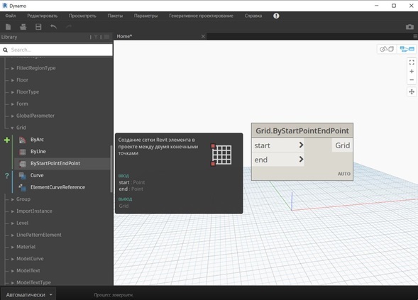 Все готовые функции распределены по группам, элементы создания объектов находятся в группе Revit. Раскроем эту группу и выберем подгруппу Elements, найдем элемент, отвечающий за оси – Grid.