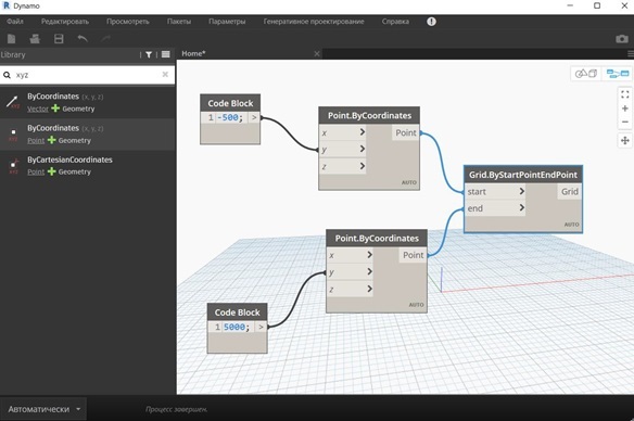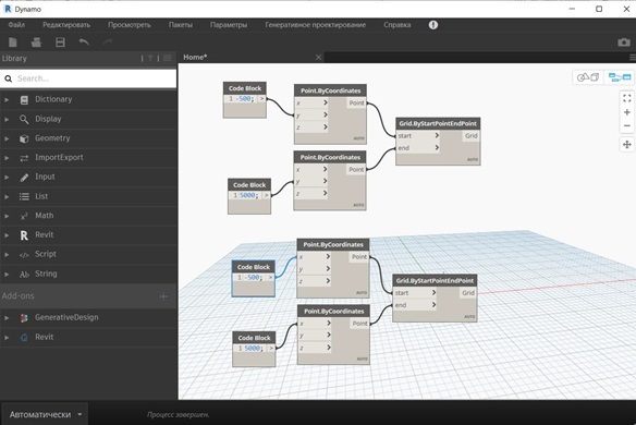 Для создания второй оси копируем всю группу нодов и поменяем координаты по x (рисунок 6). Оси сформируются, а их пересечение будет находиться ровно в точке съемки и в базовой точке проекта. Соответственно, начало координат также будет находиться в этой точке, так как DYNAMO оперирует координатами во внутренней системе.