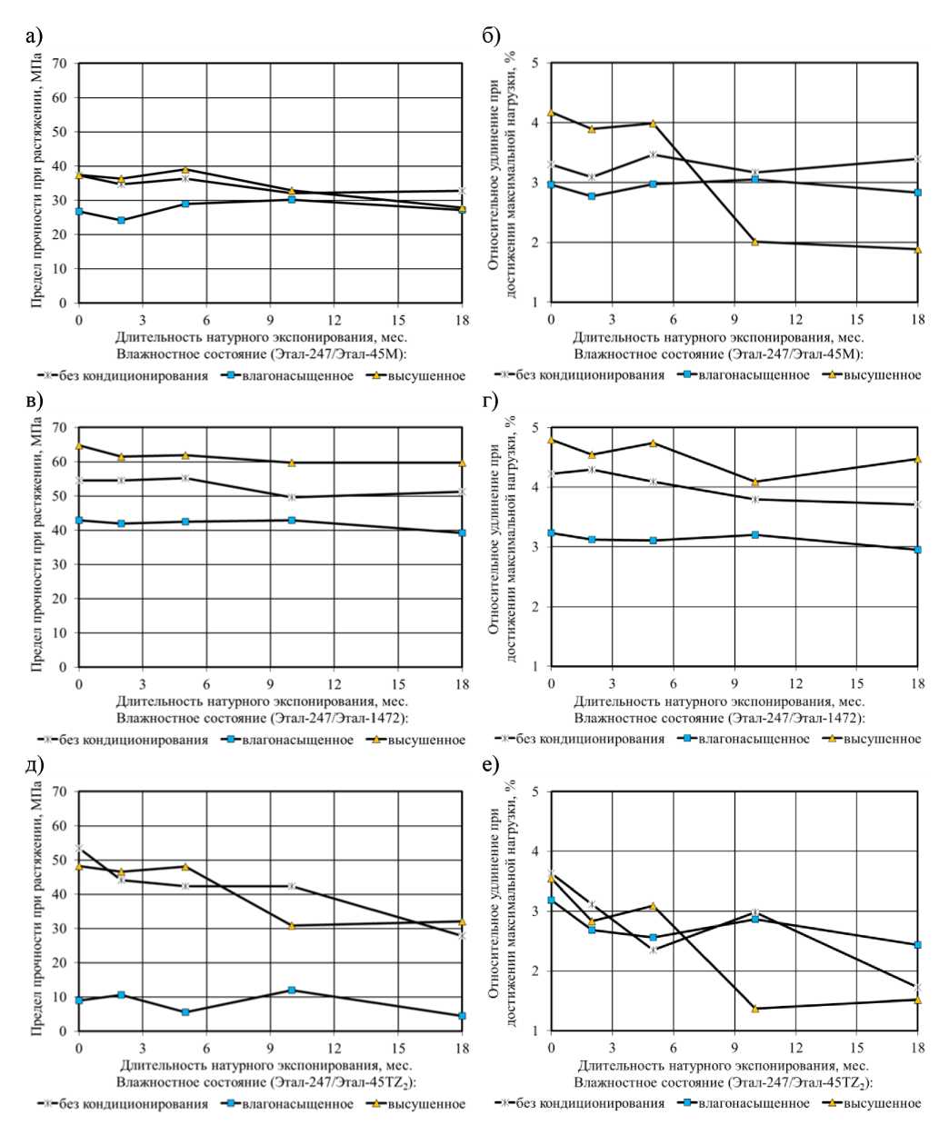 Рис. 1. Изменение предела прочности и относительного удлинения при растяжении серий образцов полимеров на основе эпоксидной смолы Этал-247, отвержденных Этал-45М (а, б), Этал-1472 (в, г) и Этал-45TZ2 (д, е), в процессе натурного экспонирования в условиях умеренно континентального климата (с учетом влажностного состояния).