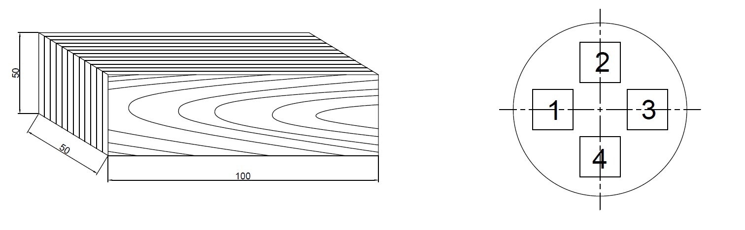 Помимо того, что использовались образцы различных типоразмеров, также они выпиливались из разных частей ствола самого дерева. Ствол делился на 4 одинаковые части при помощи четырех радиусов, направленных друг к другу под углом в 90°, и из него выпиливались брусья на одинаковом расстоянии от центра так, чтобы их грани были перпендикулярны радиусам ствола (рисунок 1).
