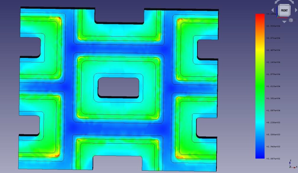 Анализируя результаты, полученные после проведения расчета модели, можно увидеть, что основные напряжения возникают именно во вторичной стенке клетки (рисунок 6). При этом в углах стенки наблюдаются наибольшие напряжения, свидетельствующие о том, что процесс отрыва волокон друг от друга начинается именно с этого места.